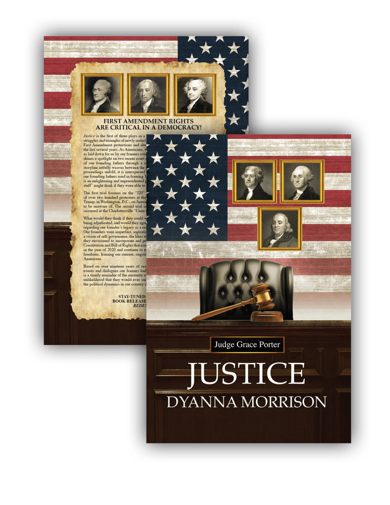 Justice is the first of three plays in a thought-provoking trilogy, following the struggles and triumphs of newly seated Judge Grace Porter. Court cases involving First Amendment abuses and protections have become highly politicized over the last several years. Justice shines a spotlight on two recent court cases, as seen through the eyes and minds of our founding fathers through a one way window in the courtroom. The storyline artfully weaves between the present and the past and as the courtroom proceedings unfold, it is interspersed with the rationale and the thought processes our founding fathers used in framing the Constitution and The Bill of Rights. It is an enlightening and unprecedented portrayal of what “the guys who wrote the stuff” might think if they were able to witness contemporary legal proceedings.